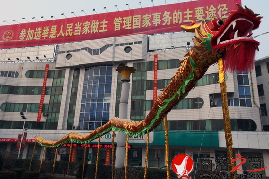 市中心廣場(chǎng),在“參加選舉是人民當(dāng)家做主、管理國(guó)家事務(wù)的主要途徑”的巨幅標(biāo)語(yǔ)下,一條騰飛的巨龍象征著我市龍年再創(chuàng)輝煌。(方 立 攝)