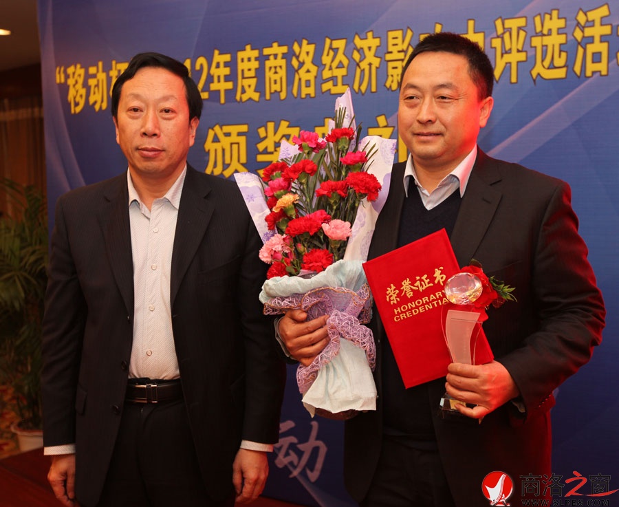 市委宣傳部副部長、商洛日報社社長何鄧為2012年度商洛最具經濟影響力人物獎項獲得者頒獎。
