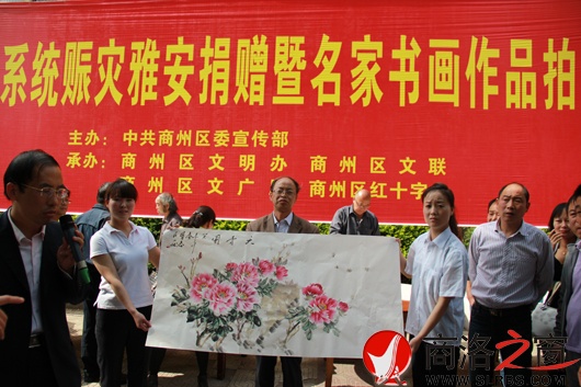 商洛日報訊(張希鋒)日前,商州區宣傳文化系統舉行賑災雅安捐贈暨名家書畫作品拍賣義捐活動,現場拍賣來自市、區22位書畫名家創作的45幅作品,此次活動共募集善款67650元。圖為現場創作的牡丹圖被成功競拍。