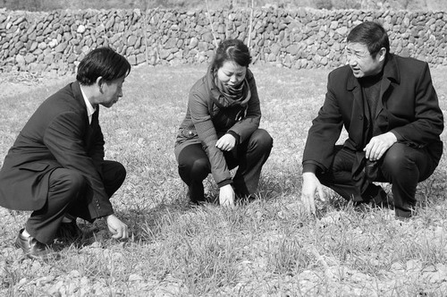 市農(nóng)科所組織技術干部到包扶村柞水縣柴莊鄉(xiāng)棗樹坪,開展以“送政策、察民情、定項目、促增收”為主題的“中央一號文件進農(nóng)家”學習宣講活動。圖為技術人員和村干部查看麥田苗情、墑情。(李建設 陳朝陽 黨丹洲 攝)
