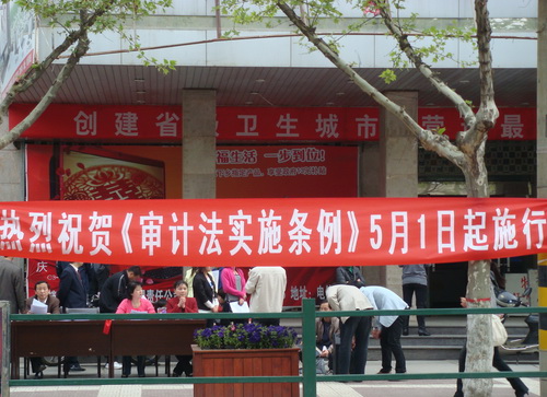 4月24日,商洛市審計局利用周末時間,組織全體干部職工40多人上街宣傳新修訂的《審計法實施條例》。現場共發放《中華人民共和國審計法實施條例》翻印本1000余冊,宣傳提綱1000余份,并將新修訂的《審計法實施條例》錄音,向廣大市民廣播宣傳。在醒目的宣傳標語下,審計干部熱情洋溢,認真細致的回答觀眾的提問,現場解答市民提問100人次,達到了良好的宣傳效果。