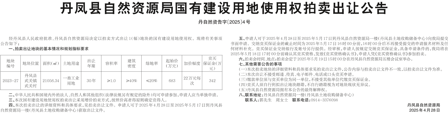 丹鳳縣自然資源局國有建設用地使用權拍賣出讓公告