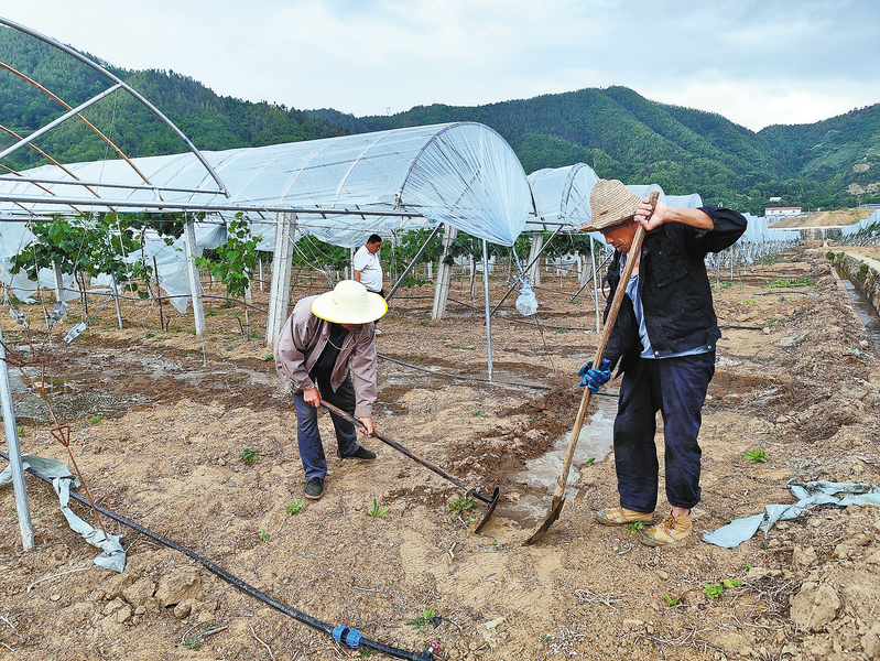 連日來,丹鳳縣土門鎮(zhèn)土門村組織群眾引水澆灌葡萄園。為做好糧食安全和水雜果園區(qū)抗旱管理,鎮(zhèn)上對(duì)產(chǎn)業(yè)園區(qū)采用“一園區(qū)一抗旱”方案,利用原有噴灌、滴灌設(shè)施有效保障土門糧食種植示范田、獼猴桃基地、葡萄基地、長(zhǎng)沙溝口村葡萄基地和大棚以及七星溝村大棚、八十河村糧食種植示范田灌溉用水。(本報(bào)記者 賈書章 攝)