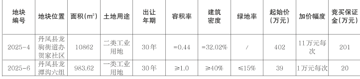 二、中華人民共和國境內外的法人和其他組織(法律法規另有規定的除外)均可申請參加,申請人應當單獨申請。三、本次國有建設用地使用權掛牌出讓按照價高者得原則確定競得人。四、本次掛牌出讓的詳細資料和具體要求,見掛牌出讓文件。申請人可于2025年5月28日至2025年6月24日到丹鳳縣自然資源局一樓(丹鳳縣土地收購儲備中心)獲取出讓文件。五、申請人可于2025年5月28日至2025年6月24日到丹鳳縣自然資源局一樓(丹鳳縣土地收購儲備中心)向我局提交書面申請。交納競買保證金的截止時間為2025年6月24日16時00分前,16時00分后不再接受提交的申請報名材料及任何材料補充。競買保證金交納銀行及賬號另行提供。經審核,申請人按規定交納競買保證金,具備申請條件的,我局將在2025年6月25日17時00分前確認其競買資格,發放《競買資格確認書》,申請人憑《競買資格確認書》參加拍賣。