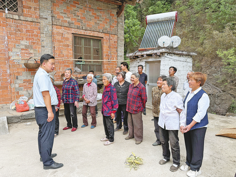 監測員敲著銅鑼扯著嗓子用方言喊:“莫拿東西先保命!”村民們扔下手中東西,趕快從家里跑出,有老人攥著孫兒的手小跑,有的相互攙扶著小跑,10分鐘內,13戶39名群眾全部抵達避災地點。