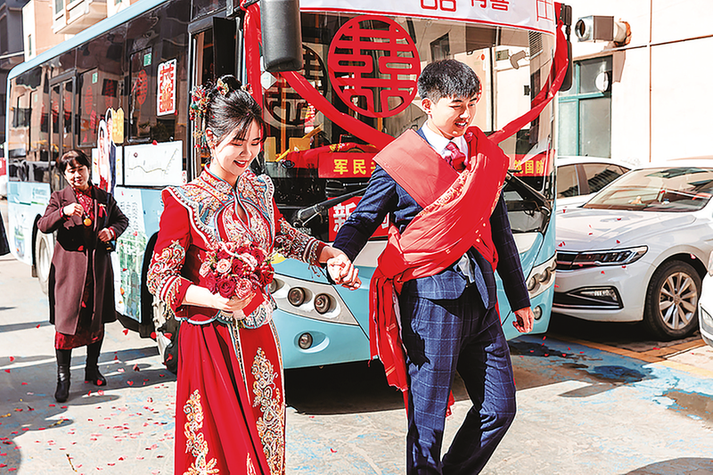 巴圖莉的新式婚禮,在洛南并非個(gè)例。洛南縣城關(guān)街道居民田添說,今年3月11日是自己和新郎張園濤結(jié)婚的好日子,但他們沒有乘坐轎車,而是選擇了乘坐公交車。“與豪華車隊(duì)相比,公交車更有性價(jià)比,氛圍感更好。”新娘田添說。