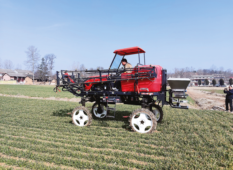 2月28日,在古城鎮(zhèn)何村連片麥田里,一臺自走式噴桿噴霧機(jī)正在作業(yè)。