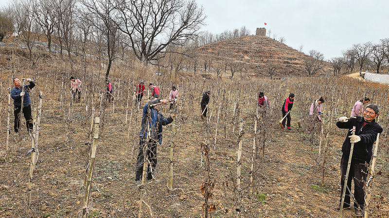御史村宏泰金銀花種植基地里,修剪后的球狀金銀花藤正孕育新芽,套種剛兩年的紅仁核桃亭亭玉立于梯田上,即將抽條。