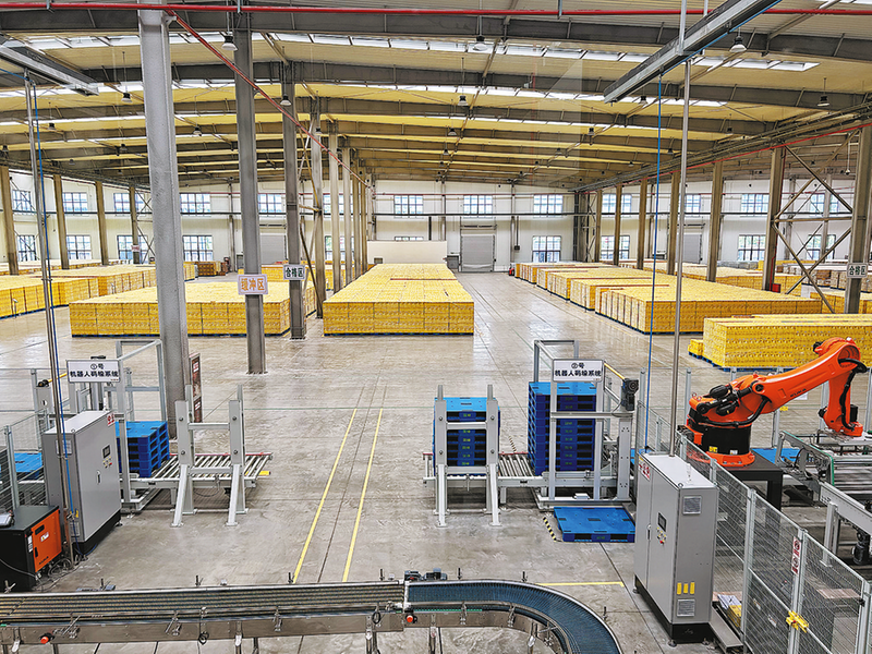 洛國蜂蜜水產(chǎn)業(yè)園建設項目倉儲車間內(nèi),一垛垛成品蜂蜜水整齊擺放在合格區(qū)位。