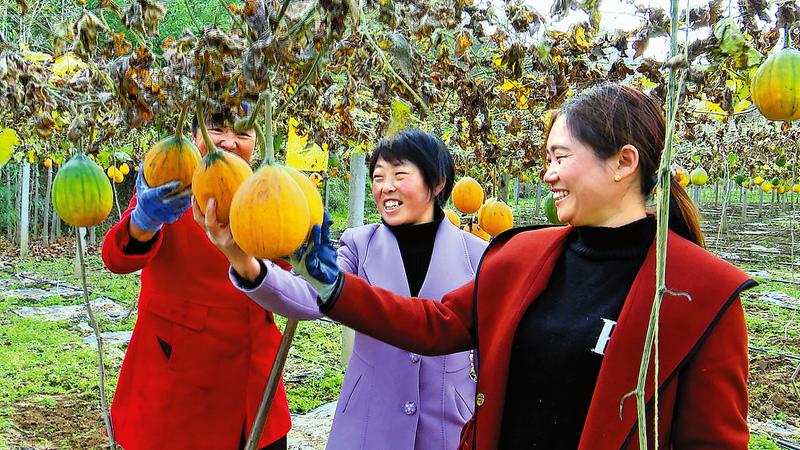 在趙川鎮店坊河村的千畝瓜蔞基地里,一排排架子上爬滿了藤蔓,大大小小、金黃色的瓜蔞掛滿枝頭,村民們滿懷喜悅地采摘瓜蔞,收獲一年的勞動成果。