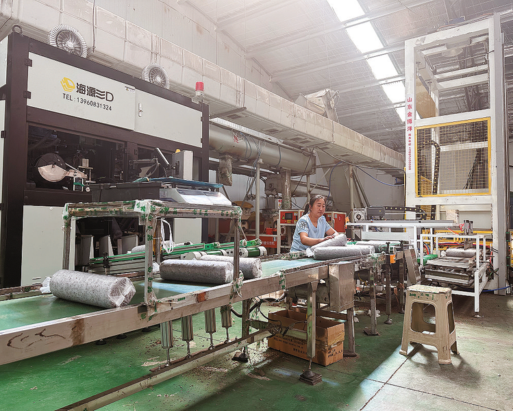 在自動裝袋區,工人范海蘭正專注地盯著傳送帶上已裝袋的菌棒,不時用手翻動調整,確保菌棒有序擺放在架子上,隨后由叉車運往高溫滅菌區。“我就是附近的村民,每天騎車幾分鐘來上班,在廠里工作兩年了。這里是計件工資,多勞多得,平均每天能掙100多元。”范海蘭笑著說。