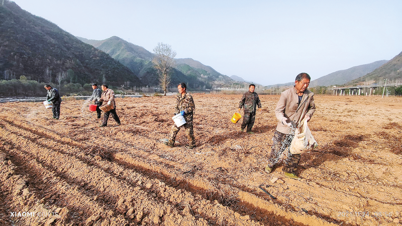 11月24日,商南縣金絲峽鎮(zhèn)畢家灣村楊家臺(tái)子組村集體產(chǎn)業(yè)基地里,村民正在撒化肥和種子。