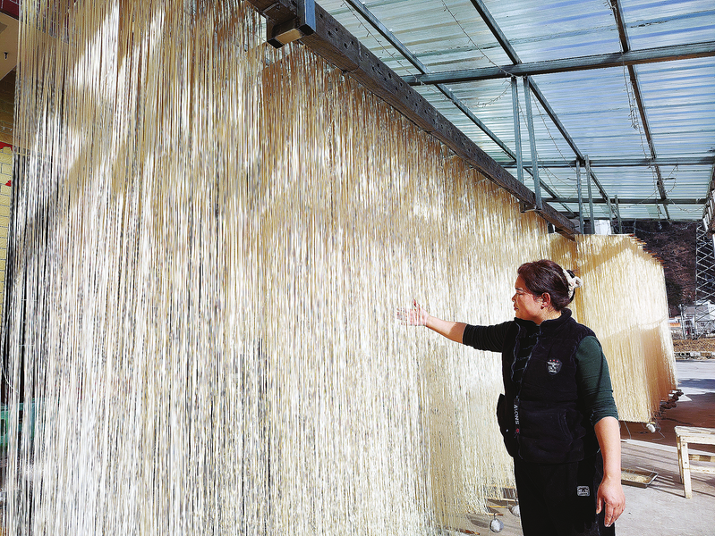 “最近天氣好,每天能做100斤的掛面,年前上門購買掛面的人特別多。”下灣村村民高海燕高興地說。雖然她還不到40歲,做掛面技術卻相當嫻熟,凌晨三點起床,和面、醒面、盤條、繞面……最后下桿,一架架掛面細若發絲、清如白玉。