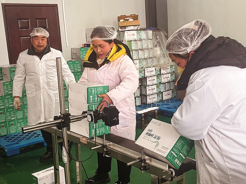 在陜西秦巴神仙葉食品有限公司的生產車間里,工人正裝箱打包神仙葉涼粉。