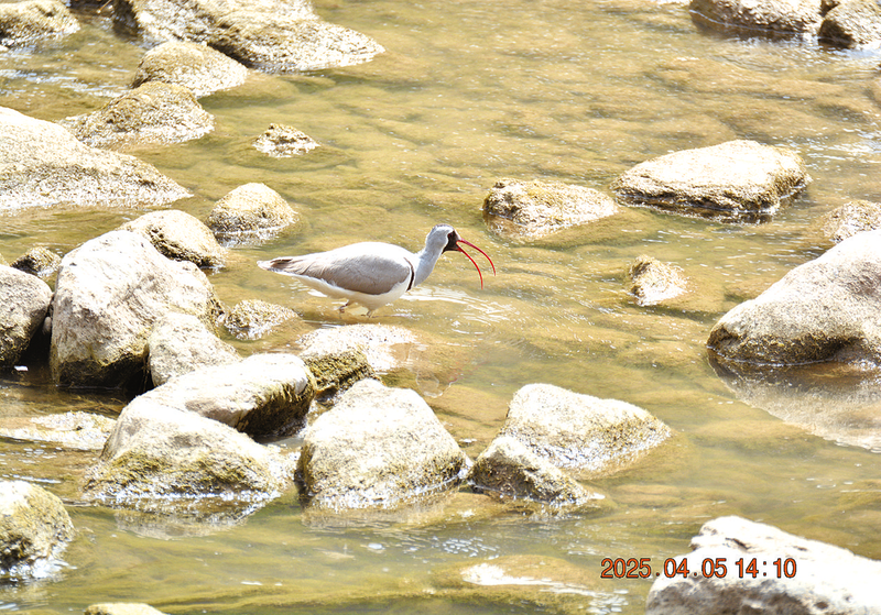 4月5日下午,調(diào)查團隊沿山陽縣金錢河徒步開展鳥類觀測時,突然聽到持續(xù)的清脆鳥鳴聲,跟隨聲音仔細辨尋后,在一個由眾多小石頭構成的河心島中發(fā)現(xiàn)了這只鹮嘴鷸。據(jù)悉,4月至7月為鹮嘴鷸的繁殖期,在4月初至4月中旬鹮嘴鷸雄鳥即開始鳴叫和追逐雌鳥,4月末5月初開始成對營巢。本次發(fā)現(xiàn)的鹮嘴鷸即為鳴叫階段的雄鳥。