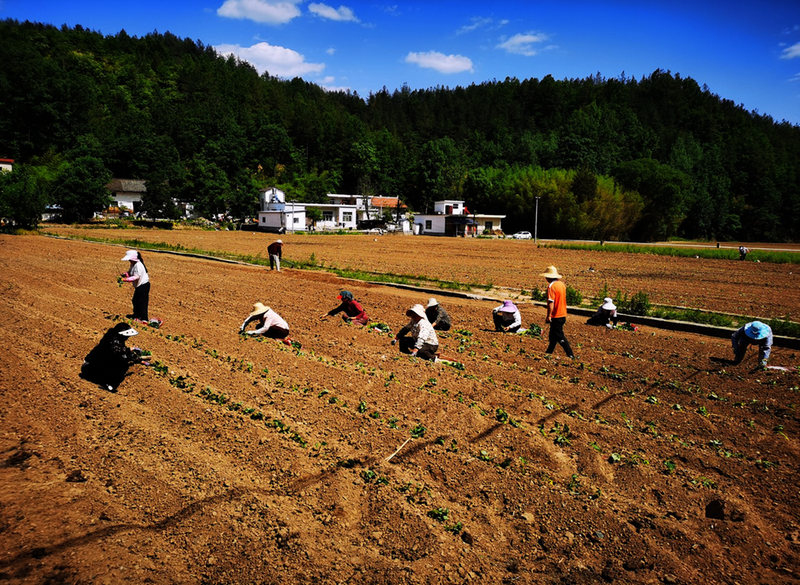 5月23日,魚塘村紅薯種植基地里,30多名村民手持嫩苗,熟練地進行插苗、覆土、壓實。在他們身后,一排排綠油油的紅薯苗整齊排列,在陽光下煥發(fā)勃勃生機。