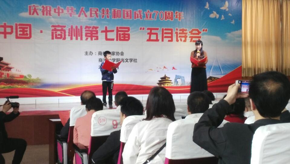 詩會(huì)活動(dòng)簡潔明快,直奔主題。十多位詩詞愛好者紛紛登臺(tái),分別朗誦了《祖國啊,我親愛的祖國》《信念》《一個(gè)村子的戰(zhàn)役》《和一座城談一場曠世的戀愛》《那年花開》《《在商州,是幸福的》《祝福五月》等膾炙人口的原創(chuàng)作品,一群身著漢服的中學(xué)生朗誦了詩文《商山賦》。一位年輕女士和一個(gè)八、九歲的男孩朗誦的《中華少年》,將整個(gè)詩會(huì)推向了高潮。