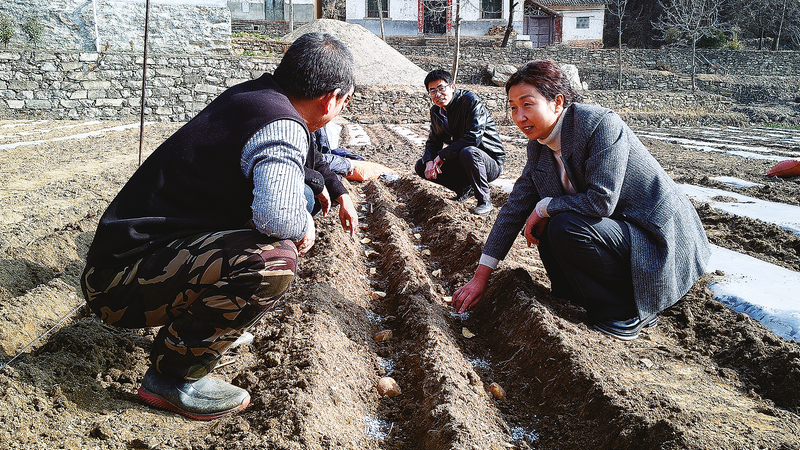 在牧護關鎮秦嶺鋪村,農業技術人員向村民傳授馬鈴薯播種與覆膜的技術。