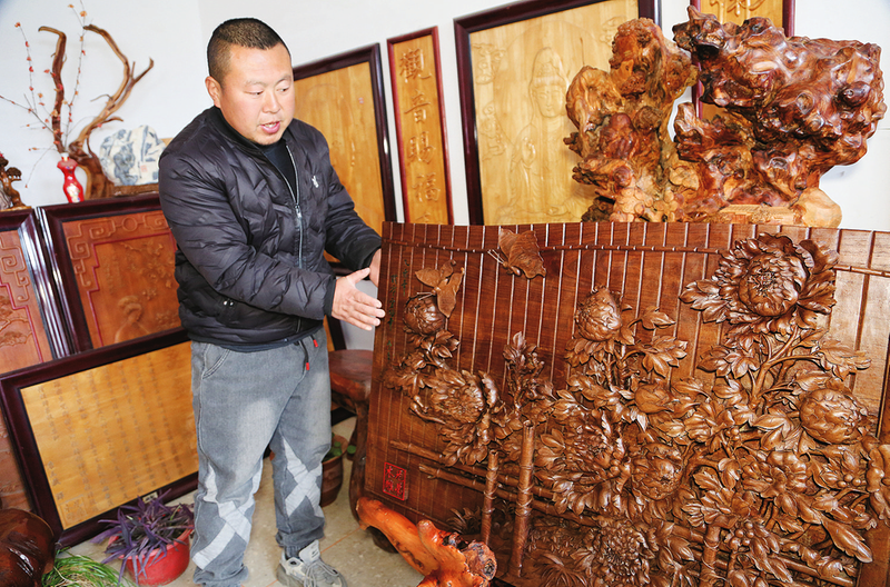 慢慢地,兩人的木雕手藝被更多人熟知,也有人專門拿著比較大的木頭前來預訂。“我們這邊雕刻用的木料基本都是棗木、柏木和核桃木,以核桃木居多。”張先保告訴記者,為了謀生,兩人不僅購置毛料,還會親自上山尋覓。平時沒事就在研究應該如何雕刻,如今,他們加工的成品涵蓋茶海、擺件、佛像、鳥獸、盆景等,同時承接門頭、牌匾、雕花等手工藝制作。