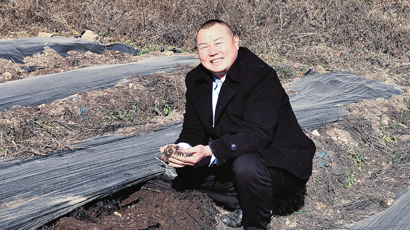 △12月4日,閔向陽在馬角村田家溝查看天麻長(zhǎng)勢(shì)。