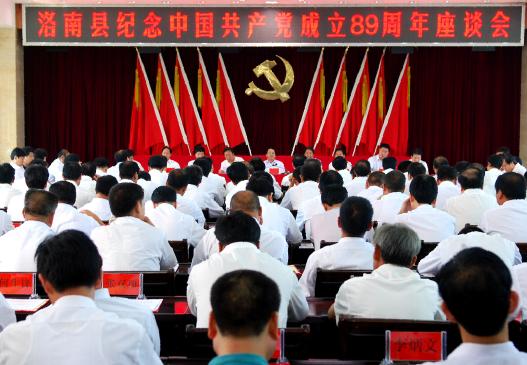 商洛之窗7月6日訊(程剛 王棟)6月28日,洛南縣召開紀念中國共產黨建黨89周年座談會。全縣各行各業的先進基層黨組織代表、優秀黨員代表、優秀黨務工作者代表、縣直工作部門和單位負責人300余人歡聚一堂,共慶黨的89歲生日。