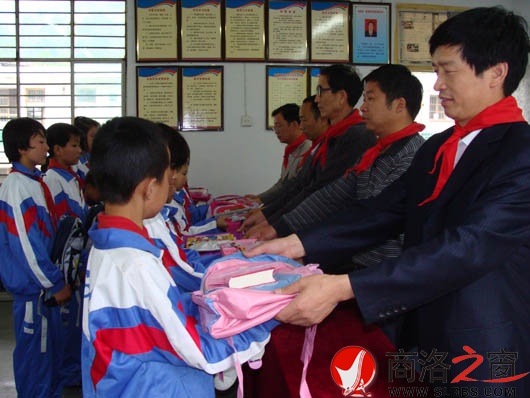 本網訊 5月30日,山陽縣慈善協會和教育局的工作人員冒雨拿著《新華字典》以及書包文具等學習用品來到該縣色河鎮中心小學,對該校40名品學兼優的貧困留守兒童進行了慰問,使這些留守兒童在自己的節日里充分感受社會大家庭的溫暖。(賈愛軍/攝)