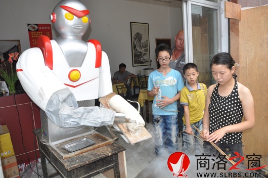 本網訊 近日,洛南縣一家餐館推出“機器人刀削面”,引來了諸多好奇的目光和絡繹不絕的食客。據經營者介紹,削面機器人是他花費兩萬元從北京購買的,因這位“伙計”削出的面長短薄厚均勻、口感勁道,吸引了眾多食客。(冀希亮/攝)