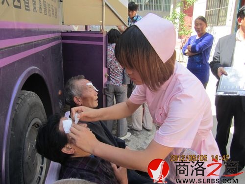 本網訊 (趙曉翔)近日,省復明手術車開進洛南,為二百多名參加新農合及醫保的白內障患者免費實施手術。圖為醫務人員正在為患者作術前檢查。