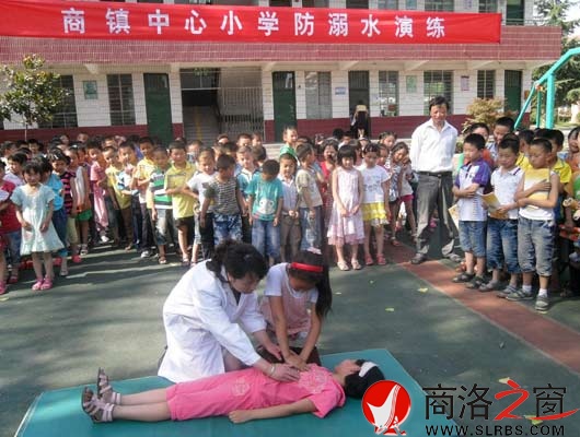 本次演練共分為三個環節:第一,由學校主管安全工作的彭書武副校長進行夏季安全知識輔導學習,特別強調了夏季防溺水工作的重要性;第二,由校醫張醫生對學生游泳容易造成溺水傷亡事故的原因以及溺水時如何緊急求助、自救進行了詳細的講解。并安排學生進行了模擬練習。第三,擬設在三種情況下學生進行求救、互救、自救的防溺水實踐演練。第一種情境是有兩名學生去游泳,一名被水溺后另一名向旁人發出求救演練;第二種情境是一名同伴被水溺后,另一名同伴用竹竿進行互救的演練;第三種情境是在游泳的過程中發生抽筋等不利情況下自救演練;第三,在張醫生手把手的指導下,學生輪流觀看對溺水者進行急救處理演練,然后個別同學扮演搶救者實踐對溺水者進行胸外心臟按摩、清理溺水者口鼻內污等。