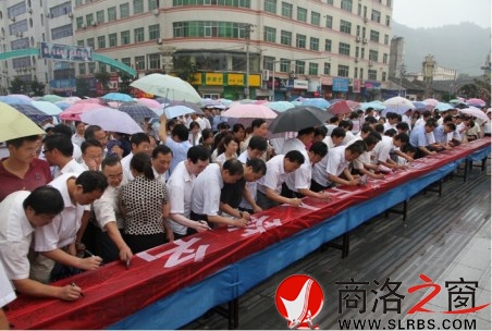 本網(wǎng)訊 (汪治 殷小會)8月13日上午,商南縣創(chuàng)建省級文明縣城指揮部在縣人民廣場組織開展了以“聯(lián)手創(chuàng)文明·你我同行動”為主題的萬人簽名活動,號召廣大市民發(fā)揚主人翁精神,從我做起,爭當文明的維護者,說文明話、辦文明事、做文明人,為省級文明縣城創(chuàng)建工作貢獻自己的力量。圖為出席活動的縣級領導和參加活動的干部群眾冒雨在“聯(lián)手創(chuàng)文明·你我同行動”橫幅上簽名。