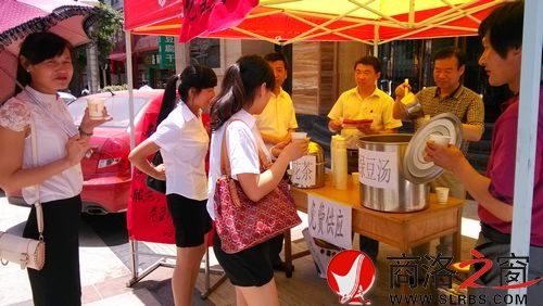 商洛日報訊(邱宏波)6月7日,洛南縣愛心人士把綠豆湯、菊花茶等消暑飲品送上街頭,免費供給高考學生及家長飲用。