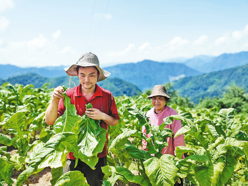 當前,烤煙進入采收期,鎮安縣永樂街道山海村煙農搶抓晴好天氣搶收煙葉。據了解,永樂街道今年預計生產煙葉六千擔、年產值七百萬元左右,小小煙葉成了當地部分群眾增收的“黃金葉”。(本報記者馬澤平攝)