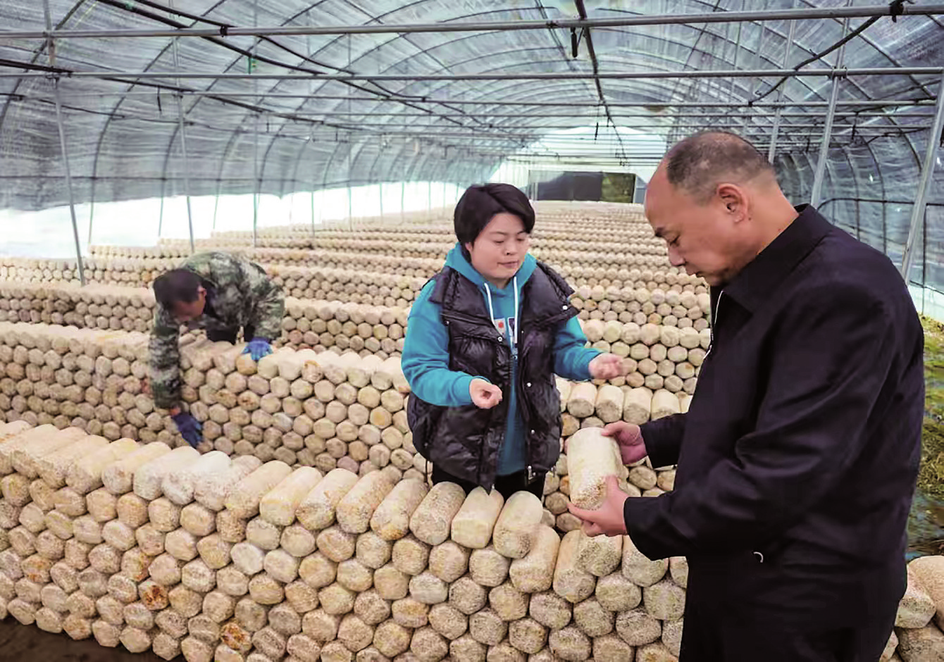 余之超(左)在木耳菌棒培育基地與技術人員一起查看菌棒的生長情況。
